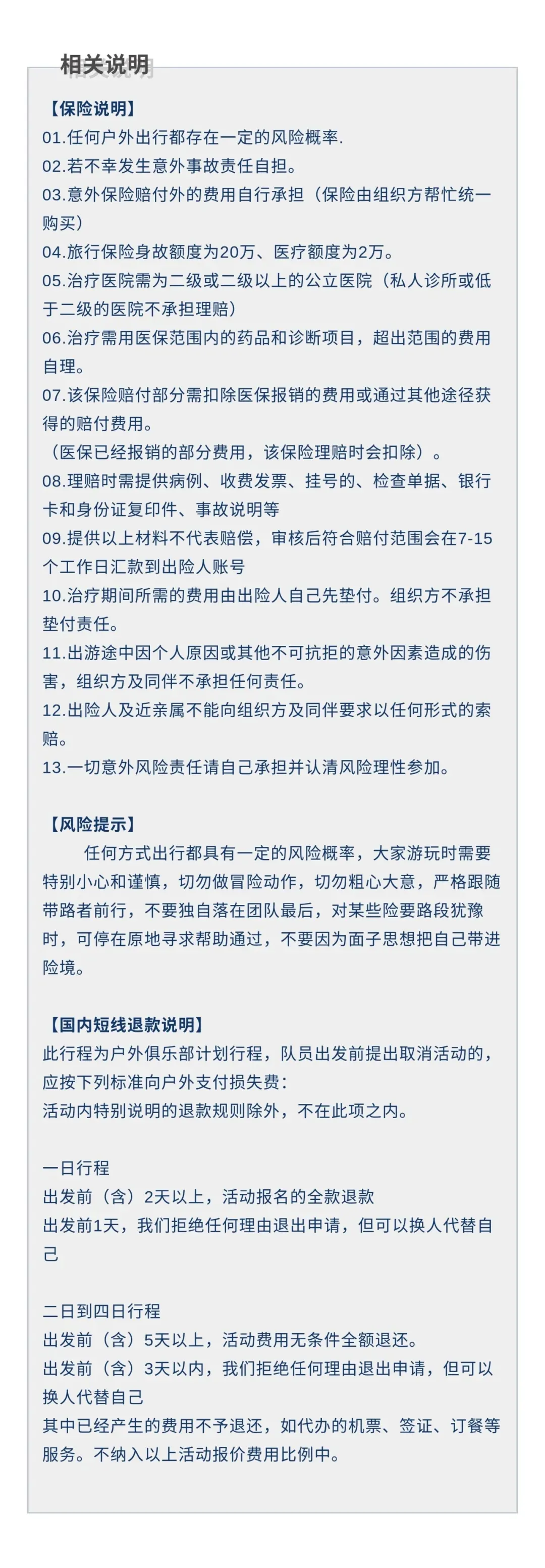 3、遇小雨本次活动照常进行,因为天气情况或者不可抗拒因素,领队有权利取消行程或进行适当的调整(如活动取消领队会提前电话通知并退还全额定金)