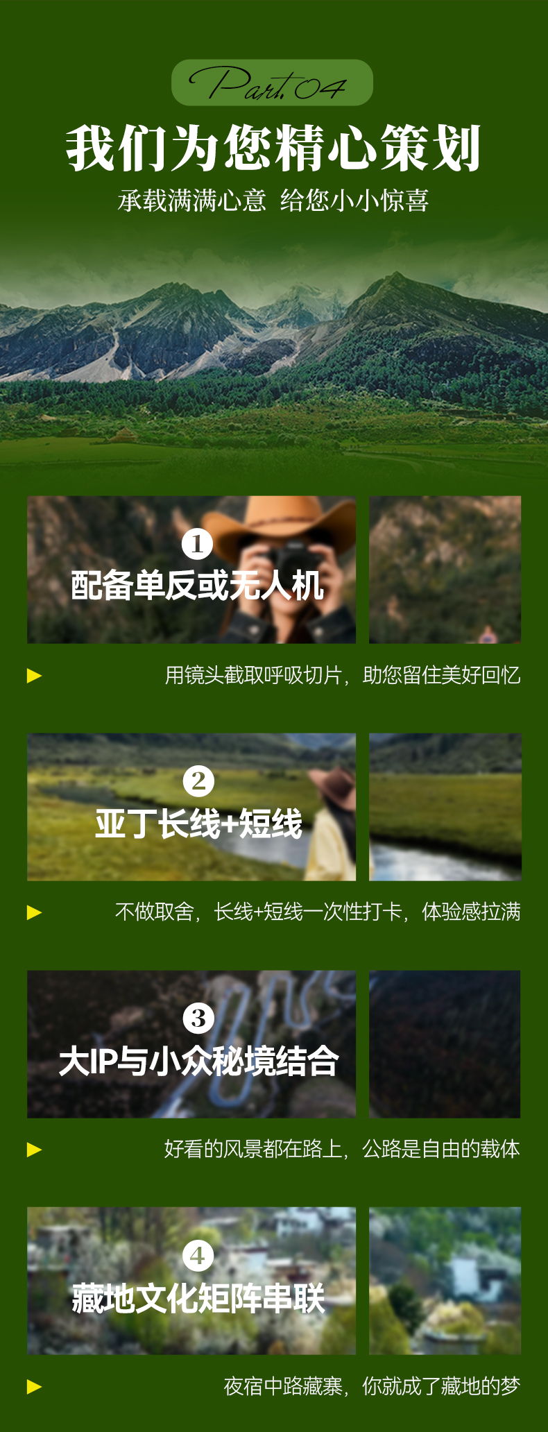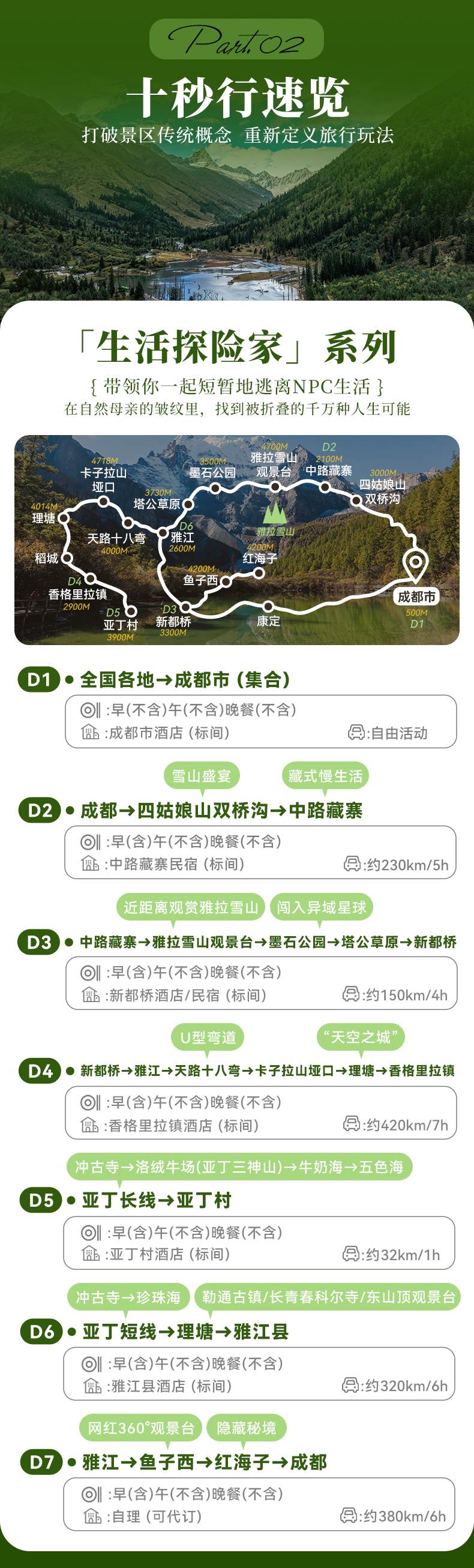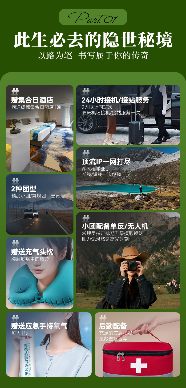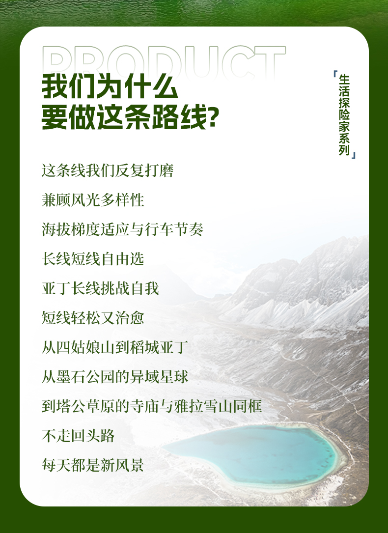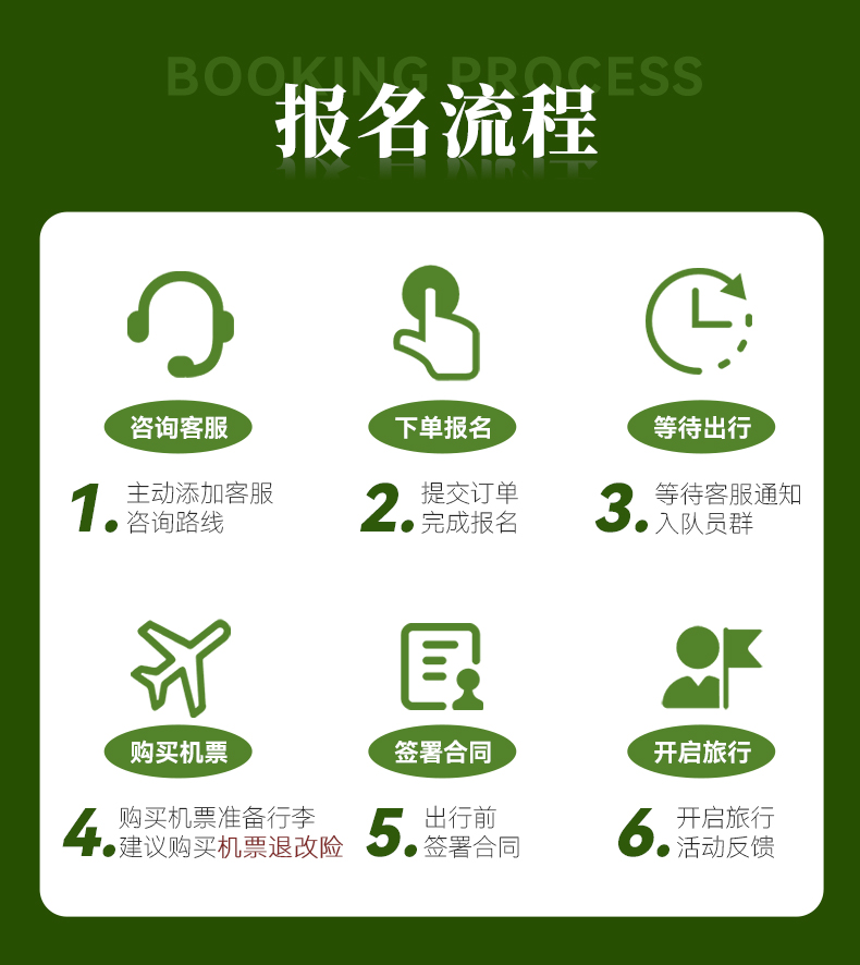 2026年【活动批次】除国庆外,其余排期每周六集合/暑期每周三/周六 常规团团型:24人封团,成团安排专业导游带队,15人及以上升级2+1保姆车。 2-8人半自由行:8人封团,司机兼向导,司机熟悉线路并建议游玩,但是没有专业的讲解能力且不进景区,请理解。 第04期:05月1日(集合日)-05月07日(散团日)五一节 第04期价格如下: 24人常规团:成人:3480元/人 单房差:1000元 儿童2160元/人 2-8人半自由行:成人:3680元/人 单房差:1000元 儿童2360元/人 第05期:05月09日(集合日)-05月15日(散团日) 第06期:05月16日(集合日)-05月22日(散团日) (第06期为摄影团期,14人以上升级摄影领队) 第07期:05月23日(集合日)-05月29日(散团日) 第08期:05月30日(集合日)-06月05日(散团日) 第05-08期如下: 24人常规团:成人:3180元/人 单房差:800元 儿童 2060元/人 2-8人半自由行:成人:3380元/人 单房差:800元 儿童2260元/人 第09期:06月06日(集合日)-06月12日(散团日) 第10期:06月13日(集合日)-06月19日(散团日) 第11期:06月19日(集合日)-06月25日(散团日)端午节 (第11期为摄影团期,14人以上升级摄影领队) 第12期:06月27日(集合日)-07月03日(散团日) 第13期:07月01日(集合日)-07月07日(散团日) 第14期:07月04日(集合日)-07月10日(散团日) 第15期:07月08日(集合日)-07月14日(散团日) 第16期:07月11日(集合日)-07月17日(散团日) 第17期:07月15日(集合日)-07月21日(散团日) 第18期:07月18日(集合日)-07月24日(散团日) 第19期:07月22日(集合日)-07月28日(散团日) (第19期为摄影团期,14人以上升级摄影领队) 第20期:07月25日(集合日)-07月31日(散团日) 第21期:07月29日(集合日)-08月04日(散团日) 第22期:08月01日(集合日)-08月07日(散团日) 第23期:08月05日(集合日)-08月11日(散团日) 第24期:08月08日(集合日)-08月14日(散团日) 第25期:08月12日(集合日)-08月28日(散团日) 第26期:08月15日(集合日)-08月21日(散团日) 第27期:08月19日(集合日)-08月25日(散团日) 第28期:08月22日(集合日)-08月28日(散团日) (第28期为摄影团期,14人以上升级摄影领队) 第29期:08月26日(集合日)-09月01日(散团日) 第9-29期如下: 24人常规团:成人:3680元/人 单房差:1000元 儿童 2360元/人 2-8人半自由行:成人:3880元/人 单房差:1000元 儿童2560元/人 第30期:08月29日(集合日)-09月04日(散团日) 第31期:09月02日(集合日)-09月08日(散团日) 第32期:09月05日(集合日)-09月11日(散团日) (第32期为摄影团期,14人以上升级摄影领队) 第33期:09月09日(集合日)-09月15日(散团日) 第34期:09月12日(集合日)-09月18日(散团日) 第35期:09月16日(集合日)-09月22日(散团日) 第30至35期价格如下: 24人常规团:成人:3380元/人 单房差:880元 儿童 2190元/人 2-8人半自由行:成人:3580元/人 单房差:880元 儿童2390元/人 第36期:09月24日(集合日)-09月30日(散团日)中秋节 第37期:09月30日(集合日)-10月06日(散团日)国庆节 第38期:10月01日(集合日)-10月07日(散团日)国庆节 第39期:10月02日(集合日)-10月08日(散团日)国庆节 第36至39期价格如下: 24人常规团:成人:4480元/人 单房差:1680元 儿童2490元/人 2-8人半自由行:成人:4680元/人 单房差:1680元 儿童2690元/人 第40期:10月10日(集合日)-10月16日(散团日) (第40期为摄影团期,14人以上升级摄影领队) 第41期:10月17日(集合日)-10月23日(散团日) 第42期:10月24日(集合日)-10月30日(散团日) 第43期:10月31日(集合日)-11月06日(散团日) 第44期:11月07日(集合日)-11月13日(散团日) 第45期:11月14日(集合日)-11月20日(散团日) (第45期为摄影团期,14人以上升级摄影领队) 第40至45期价格如下: 24人常规团:成人:3580元/人 单房差:1000元 儿童2260元/人 2-8人半自由行:成人:3780元/人 单房差:1000元 儿童2460元/人 第46期:11月21日(集合日)-11月27日(散团日) 第47期:11月28日(集合日)-12月04日(散团日) 第48期:12月05日(集合日)-12月11日(散团日) 第49期:12月12日(集合日)-12月18日(散团日) 第46至49期价格如下: 24人常规团:成人:3180元/人 单房差:800元 儿童2080元/人 2-8人半自由行:成人:3380元/人 单房差:800元 儿童2280元/人 |