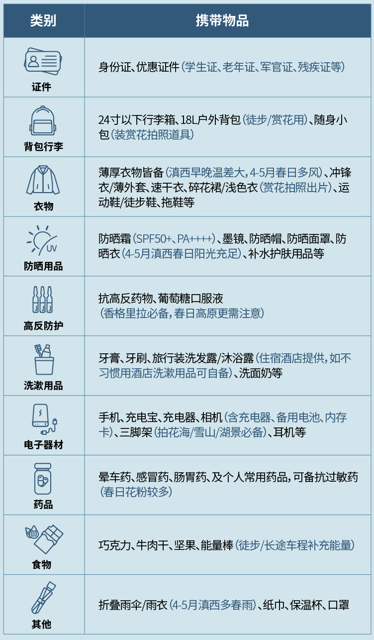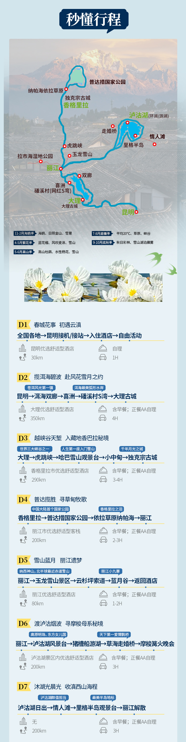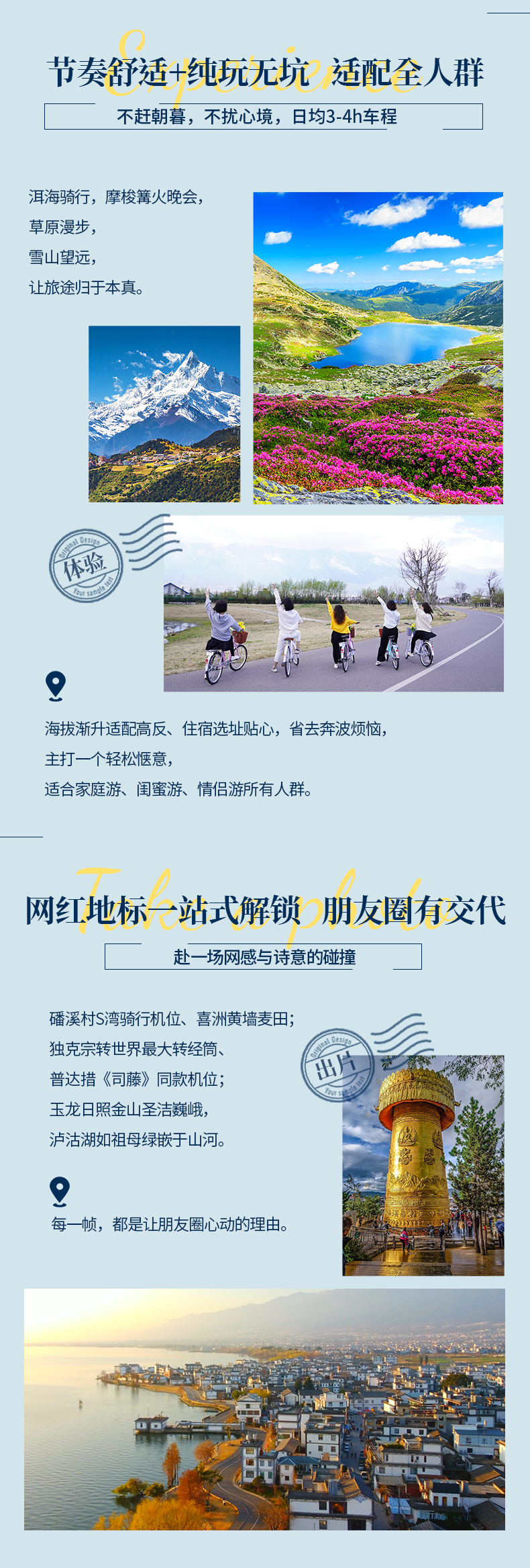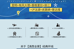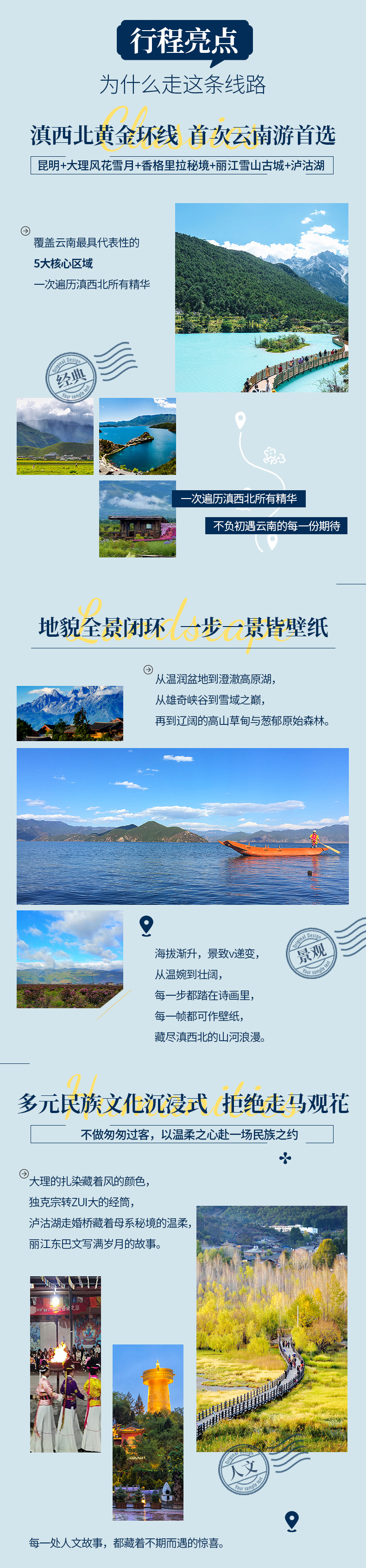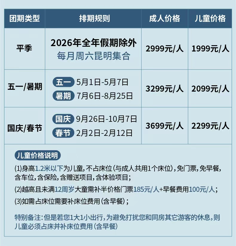 交通:不包含各地到达昆明集合、丽江散团的往返大交通费用(如:机票和高铁火车票等,提前预定通常折扣都会很低);