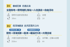 今日贵宾自行乘坐航班或动车抵达昆明集合,我司接送组工作人员接机/接站后前往市区入住集合日指定酒店,抵达后自行到前台报名字办理入住。入住后自由活动,工作人员晚点会联系你,外出请务必注意人身和财务安全。