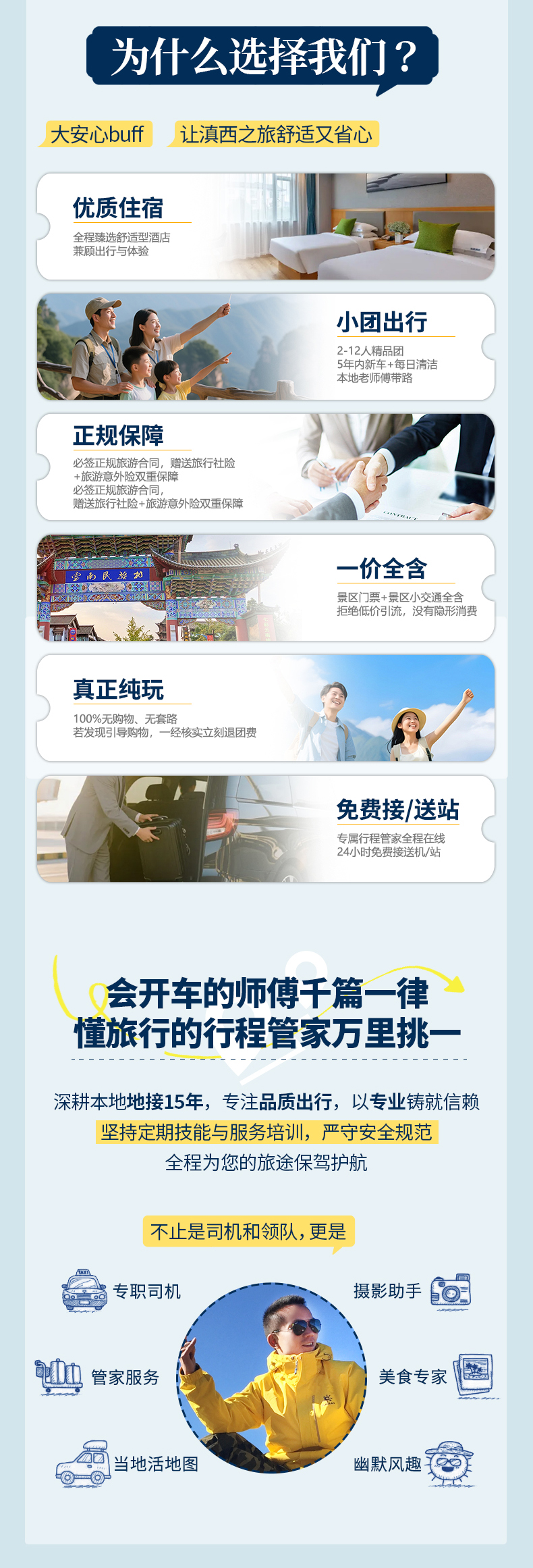 特别提醒:在游玩过程中,部分景区,观景台,古城、镇,餐厅等,都有商家自行设有购物场所,但此行为与我司无关,请尊贵的客户以游玩开心为主,切记理性消费!