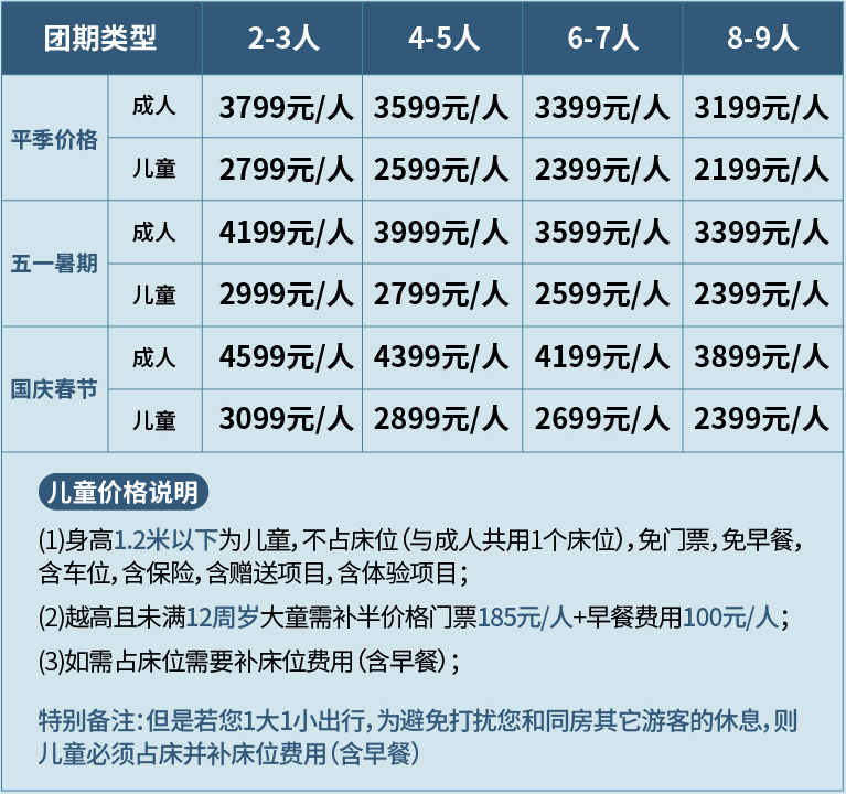房差:自然拼房2-3人标准间,如不愿拼房或拼不上房者须补单房差(平季600元/人,五一暑期900元/人,国庆春节1200元/人);