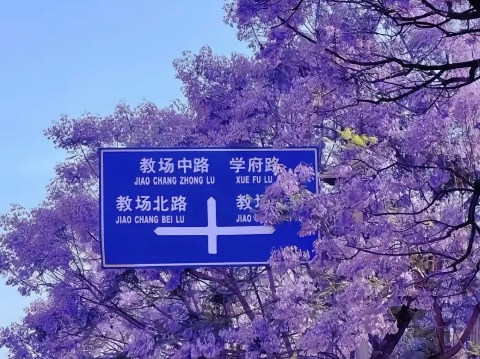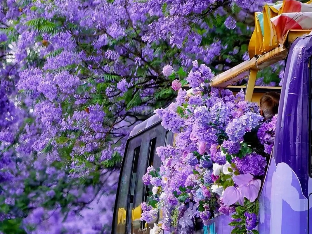 昆明蓝花楹,盛花期 (盛花期4.25-5.8)、位置:教场中路(顶流隧道)、盘龙江(江景倒影)、春城路(矮墙人像友好)铁皮巷(小众,红砖+蓝花楹)