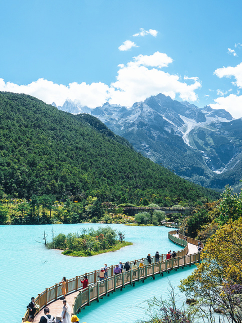随后游览【蓝月谷】景区的玉液湖、镜潭湖、蓝月湖、听涛湖、白水河。蓝月谷源自雪山冰川的万古冰雪消融之后顺着峭壁流淌而下,不断汇集为山涧、溪流,最终在蓝月谷上游深谷之中形成了清澈见底、甘冽无比的河流,也叫白水河。游览完玉龙雪山后,返回酒店。