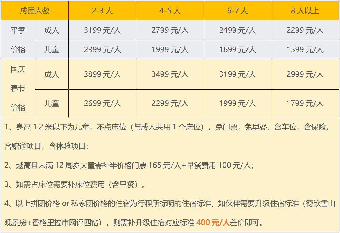 房差:自然拼房2-3人标准间,如不愿拼房或拼不了房者须补单房差(平季600元/人,暑期1000元/人,国庆/春节1500元/人);