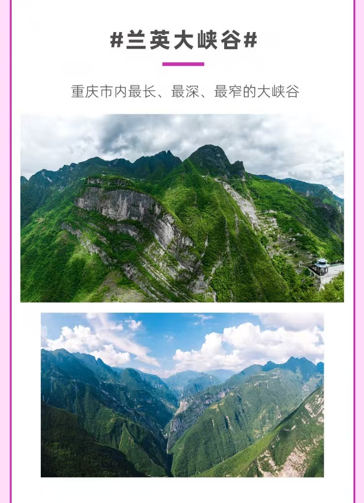 今天是探秘的一天!早餐后,换乘当地小车前往有“重庆第一深谷”之美誉的【兰英大峡