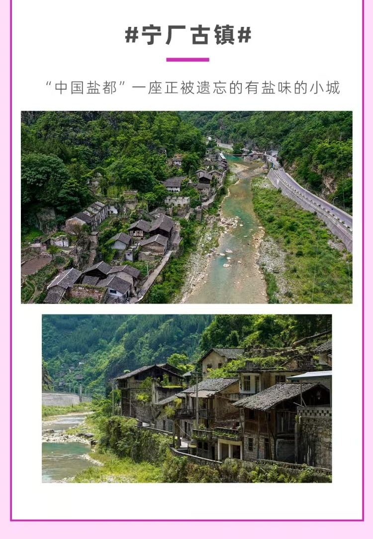 下午适时返回,前往【宁厂古镇】,宁厂古镇位于重庆巫溪县附近,是中国早期制盐地之一,宁厂古镇有4000多年的制盐史,远古时期是"不绩不经,服也;不稼不樯,食也"的乐土,在唐尧时期就是极盛一时的巫咸国的本土和首会所在地。晚宿巫溪县