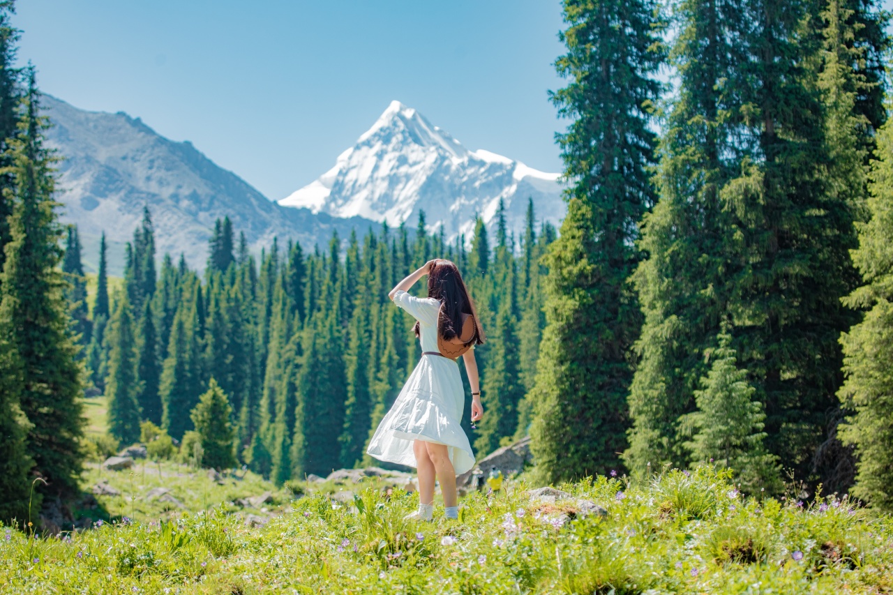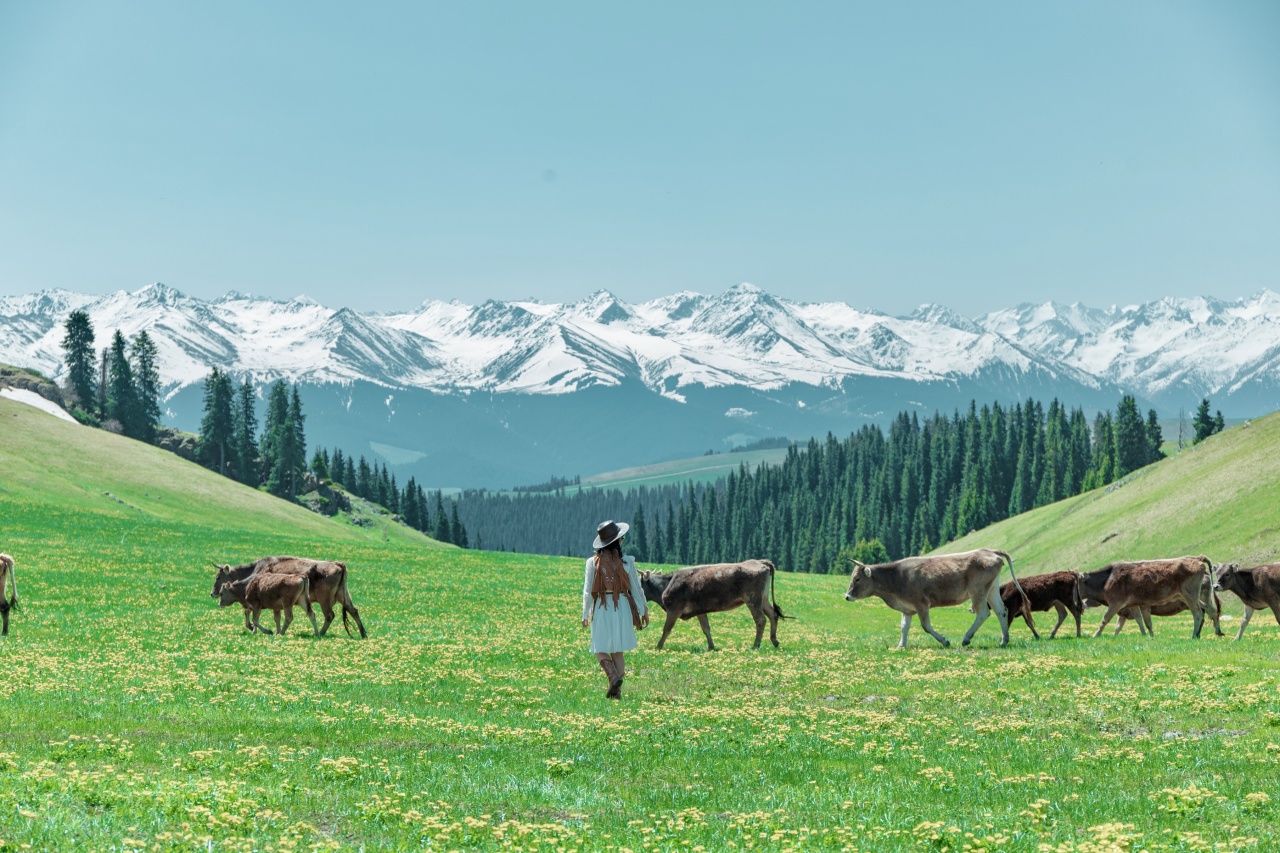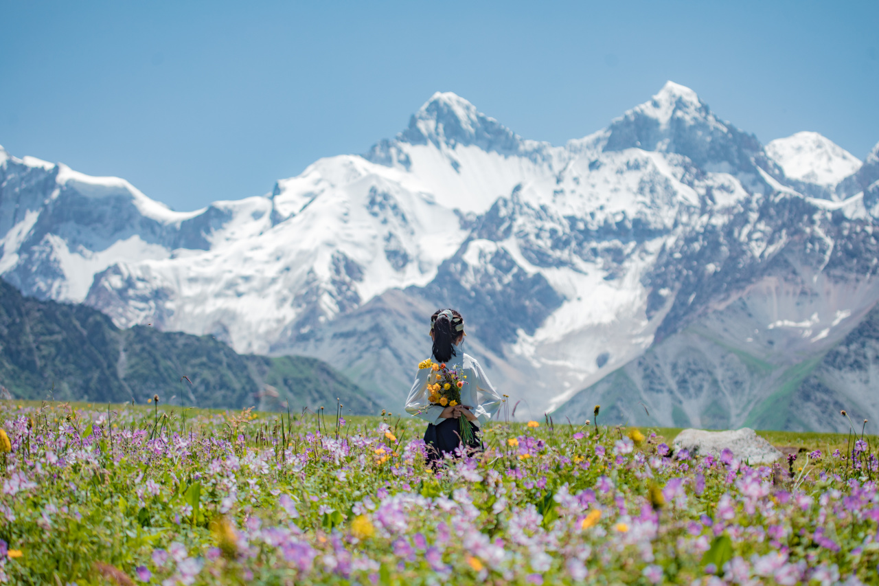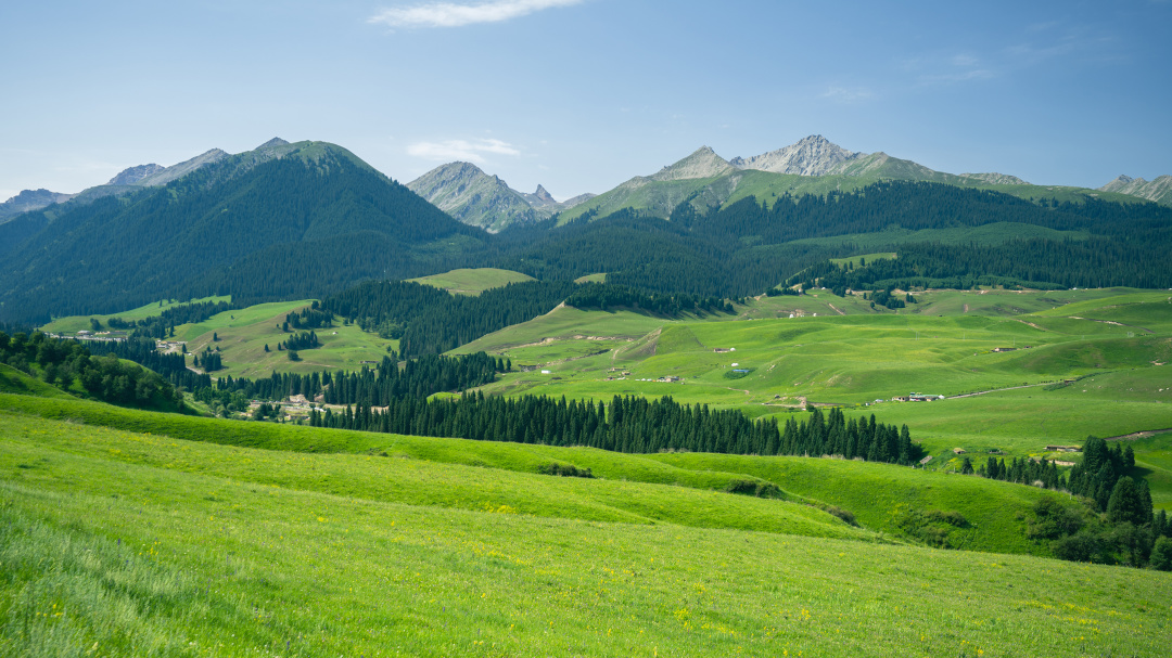 登上观景台,视野豁然开朗,远处是连绵起伏的天山山脉,山顶白雪皑皑,山脚下是无垠的草原,五彩斑斓的花簇点缀其间。
