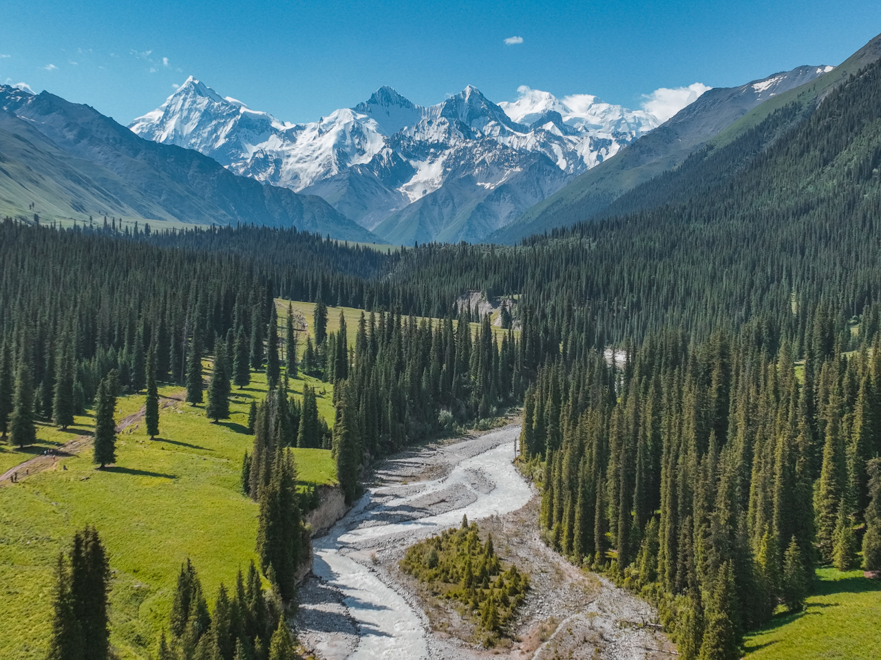 沿着栈道穿行于森林与花海之间,一步一景,远处是终年不化的雪山冰川,脚下是满目翠绿的花海草原。冰川、雪山、森林、草原同框,仿佛把新疆的壮丽都揉进了这片峡谷里。