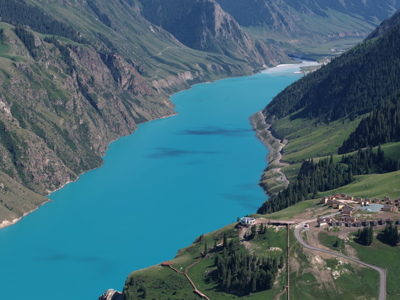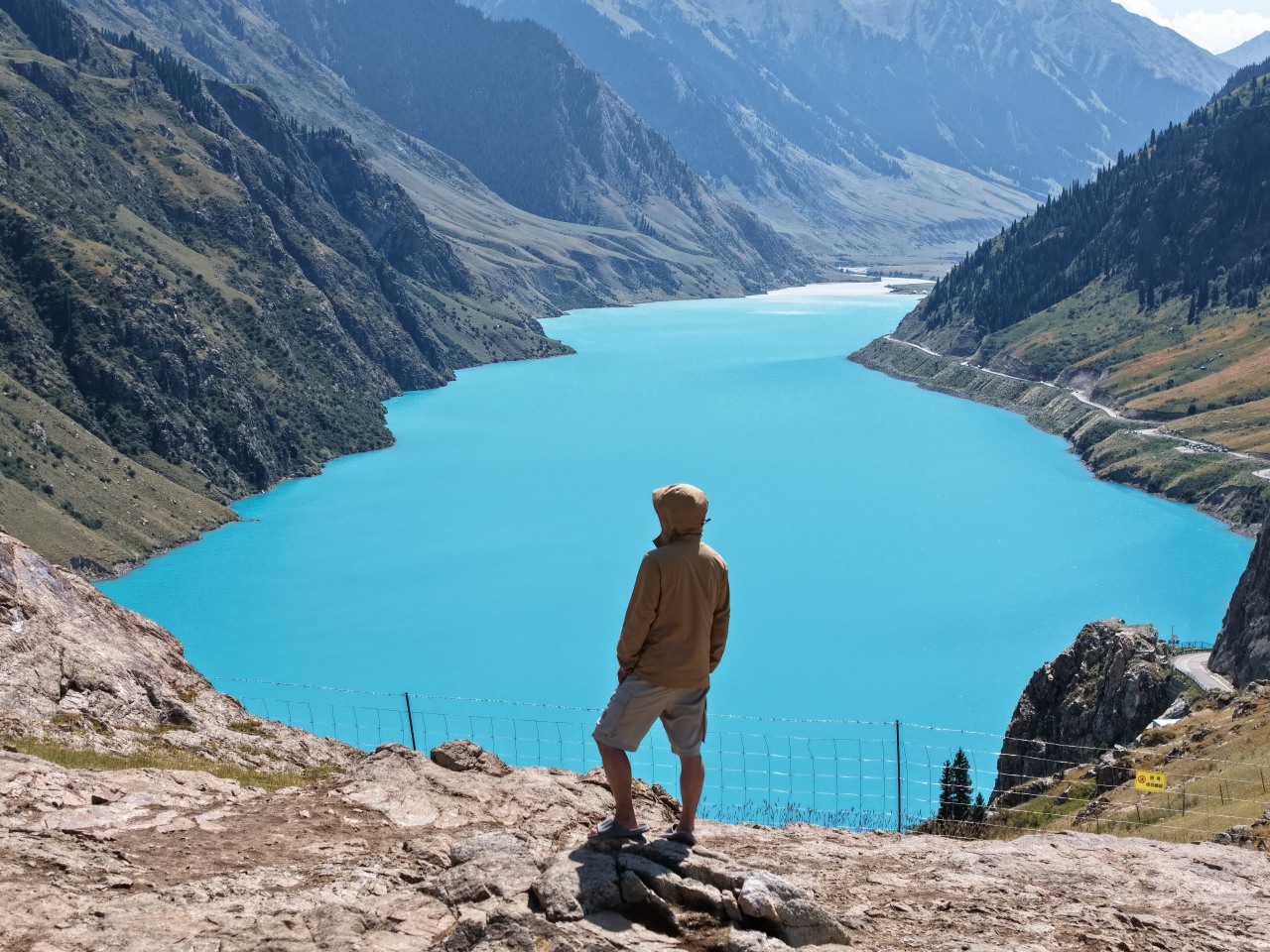 沿着云杉林间的栈道爬上松树头山顶,左边是赛里木湖那汪“蓝宝石眼泪”,右边是果子沟大桥如“巨龙穿山”,自然风光和大国工程的碰撞间尽显山河壮阔。