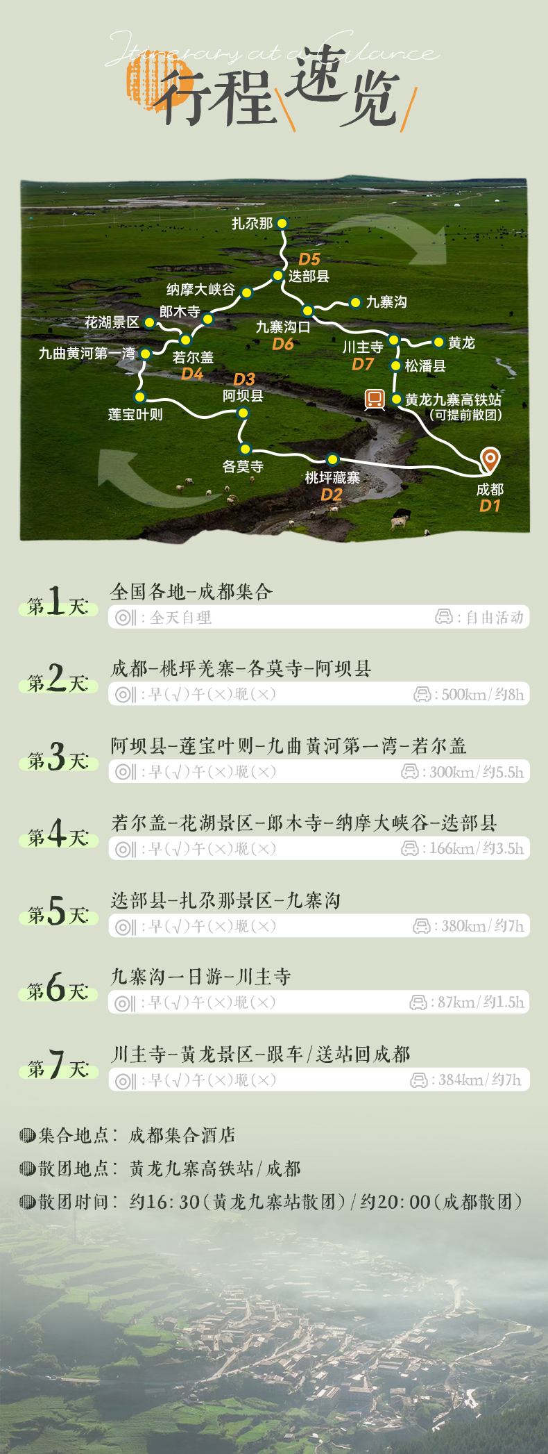 2026年【活动批次】除国庆外,其余排期每周六集合/暑期每周三/周六 常规团团型:24人封团,成团安排专业导游带队,15人及以上升级2+1保姆车。 2-8人半自由行:8人封团,司机兼向导,司机熟悉线路并建议游玩,但是没有专业的讲解能力且不进景区,请理解。 第01期:04月04日(集合日)-04月10日(散团日)清明节 第02期:04月11日(集合日)-04月17日(散团日) 第03期:04月18日(集合日)-04月24日(散团日) 第01至03期价格如下: 24人常规团: 成人:3380元/人,单房差:880元,儿童:1780元/人 2-8人半自由行: 成人:3580元/人,单房差:880元,儿童:1980元/人 第04期:05月1日(集合日)-05月07日(散团日)五一节 第04期价格如下: 24人常规团: 成人:3580元/人,单房差:1180元,儿童:1680元/人 2-8人半自由行: 成人:3780元/人,单房差:1180元,儿童:1880元/人 第05期:05月09日(集合日)-05月15日(散团日) 第06期:05月16日(集合日)-05月22日(散团日) 第07期:05月23日(集合日)-05月29日(散团日) 第08期:05月30日(集合日)-06月05日(散团日) (第08期为摄影团期,14人以上升级摄影领队) 第09期:06月06日(集合日)-06月12日(散团日) 第05-09期如下: 24人常规团: 成人:3480元/人,单房差:900元,儿童:1880元/人 2-8人半自由行: 成人:3680元/人,单房差:900元,儿童:2080元/人 第10期:06月10日(集合日)-06月16日(散团日) 第11期:06月13日(集合日)-06月19日(散团日) 第12期:06月15日(集合日)-06月21日(散团日)(端午节) 第13期:06月19日(集合日)-06月25日(散团日)(端午节) (第13期为摄影团期,14人以上升级摄影领队) 第14期:06月24日(集合日)-06月30日(散团日) 第15期:06月27日(集合日)-07月03日(散团日) 第16期:07月01日(集合日)-07月07日(散团日) 第17期:07月04日(集合日)-07月10日(散团日) 第18期:07月08日(集合日)-07月14日(散团日) 第19期:07月11日(集合日)-07月17日(散团日) (第19期为摄影团期,14人以上升级摄影领队) 第20期:07月15日(集合日)-07月21日(散团日) 第21期:07月18日(集合日)-07月24日(散团日) 第22期:07月22日(集合日)-07月28日(散团日) 第23期:07月25日(集合日)-07月31日(散团日) 第24期:07月29日(集合日)-08月04日(散团日) 第25期:08月01日(集合日)-08月07日(散团日) 第26期:08月05日(集合日)-08月11日(散团日) 第27期:08月08日(集合日)-08月14日(散团日) 第28期:08月12日(集合日)-08月18日(散团日) (第28期为摄影团期,14人以上升级摄影领队) 第29期:08月15日(集合日)-08月21日(散团日) 第30期:08月19日(集合日)-08月25日(散团日) 第31期:08月22日(集合日)-08月28日(散团日) (第31期为摄影团期,14人以上升级摄影领队) 第32期:08月26日(集合日)-09月01日(散团日) 第10-32期如下: 24人常规团: 成人:3980元/人,单房差:1100元,儿童:2180元/人 2-8人半自由行: 成人:4180元/人,单房差:1100元,儿童:2380元/人 第33期:08月29日(集合日)-09月04日(散团日) 第35期:09月05日(集合日)-09月11日(散团日) 第36期:09月09日(集合日)-09月15日(散团日) 第37期:09月12日(集合日)-09月18日(散团日) 第38期:09月16日(集合日)-09月22日(散团日) 第33至38期价格如下: 24人常规团: 成人:3680元/人,单房差:1000元,儿童:1980元/人 2-8人半自由行: 成人:3880元/人,单房差:1000元,儿童:2180元/人 第39期:09月24日(集合日)-09月30日(散团日)中秋节 第40期:09月30日(集合日)-10月06日(散团日)国庆节 第41期:10月01日(集合日)-10月07日(散团日)国庆节 第42期:10月02日(集合日)-10月08日(散团日)国庆节 第39至42期价格如下: 24人常规团: 成人:4680元/人,单房差:1600元,儿童:2380元/人 2-8人半自由行: 成人:4880元/人,单房差:1600元,儿童:2580元/人 第43期:10月17日(集合日)-10月23日(散团日) 第44期:10月24日(集合日)-10月30日(散团日) 第43至44期价格如下: 成人:3980元/人,单房差:1100元,儿童:2180元/人 2-8人半自由行: 成人:4180元/人,单房差:1100元,儿童:2380元/人 第45期:10月31日(集合日)-11月06日(散团日) 第46期:11月07日(集合日)-11月13日(散团日) 成人:3780元/人,单房差:1080元,儿童:1980元/人 2-8人半自由行: 成人:3980元/人,单房差:1080元,儿童:2180元/人 |