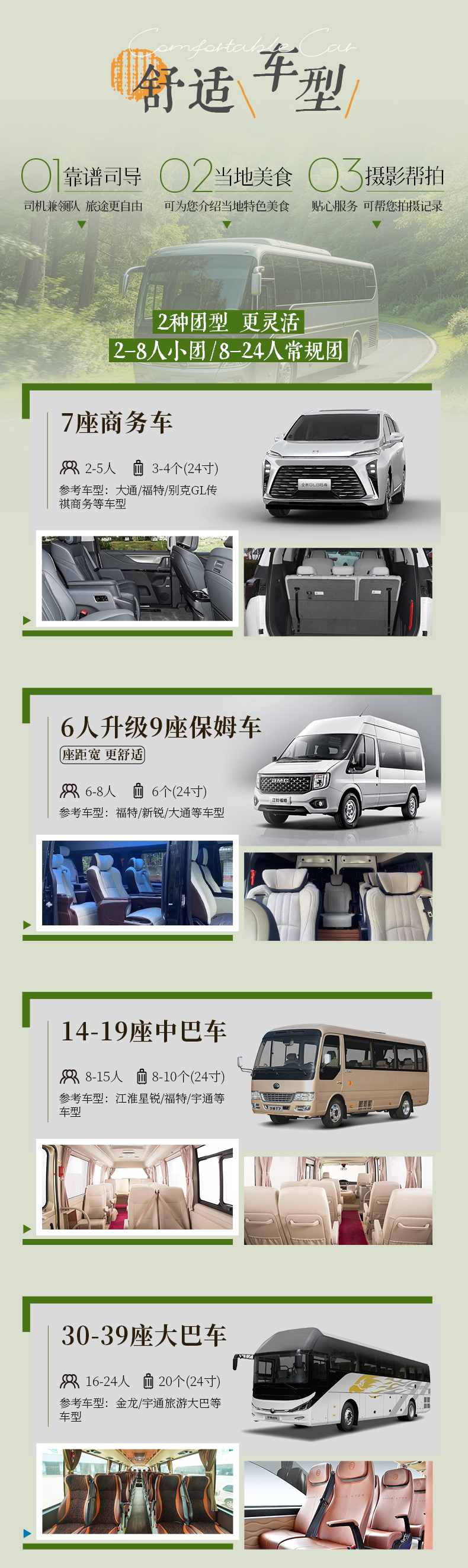 1、交通:全程包车往返,根据人数选择合适车型。