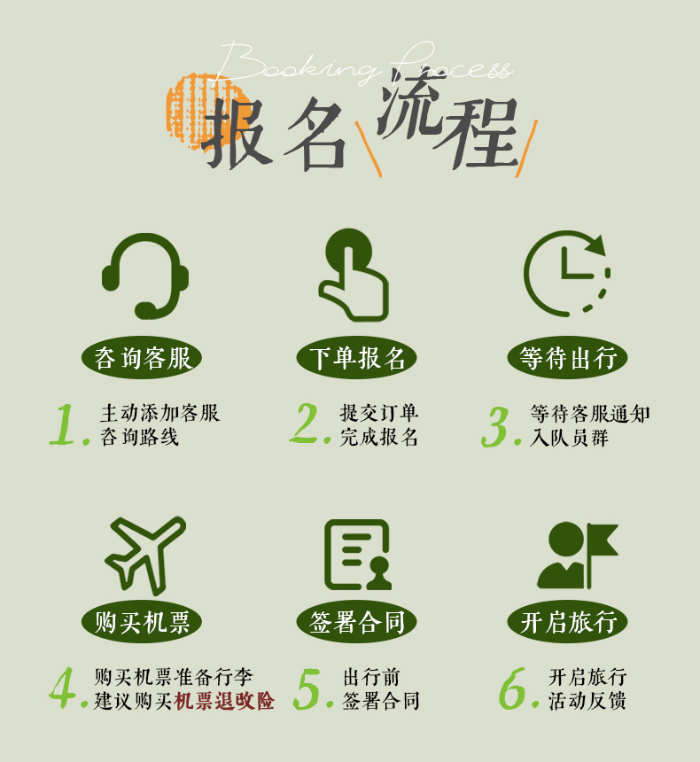 活动成团说明: A.我们会在第一时间通知成团信息,最晚会在出行前7天通知; B.若人数不足成团标准,可改期至其他日期或无损退团退款: C.建议小伙伴们报名活动确认成团后,再购买大交通,以避免不必要的损失。 |